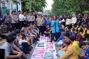 “Kami minta DPRD mau bersepakat dengan kami, menolak apa yang jadi tuntutan kami,” teriak Abdullah, salah satu koordintor aksi.
